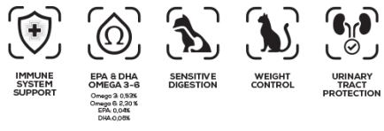 Zusammensetzung: Frisches Geflügelfleisch (25%), Geflügelprotein (getrocknet), Reis, Reismehl, Frische Leber (5%), Lebermehl, Proteinhydrolysat, Rübentrockenschnitzel, Tierfett, Leinsamen, Erbsenfasern, Fischöl, Calciumcarbonat, Fischmehl, Vollei (getrocknet) 0,5%, Erbsen (getrocknet), Hefe (getrocknet, inkl. 0,1% Mannanoligosaccharide, 0,06% Beta-Glucane), Kaliumchlorid, Blaubeeren (getrocknet, 0,1%), Preiselbeeren (getrocknet, 0,1%), Grünlippmuschelextrakt, Ringelblumenblüten (getrocknet), Chicorée (getrocknet), Yucca (getrocknet).